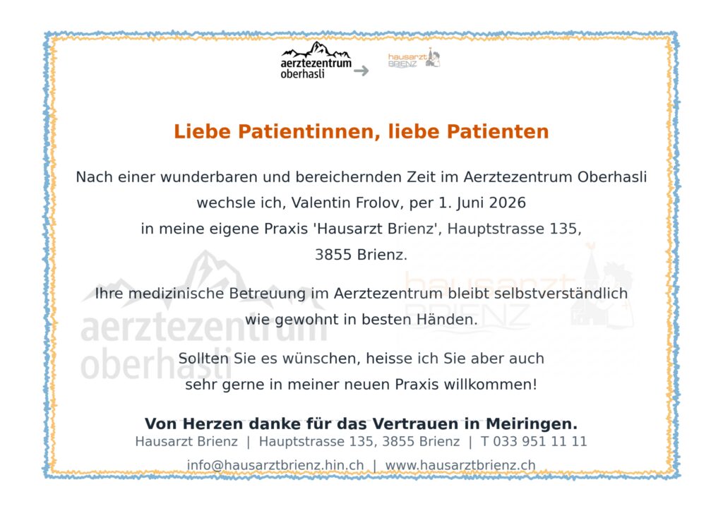Wir gewährleisten eine fachlich kompetente Versorgung im Haslital. Dank unserer Vernetzung bieten wir unseren Patientinnen und Patienten ein breites Spektrum an ärztlichen Dienstleistungen.